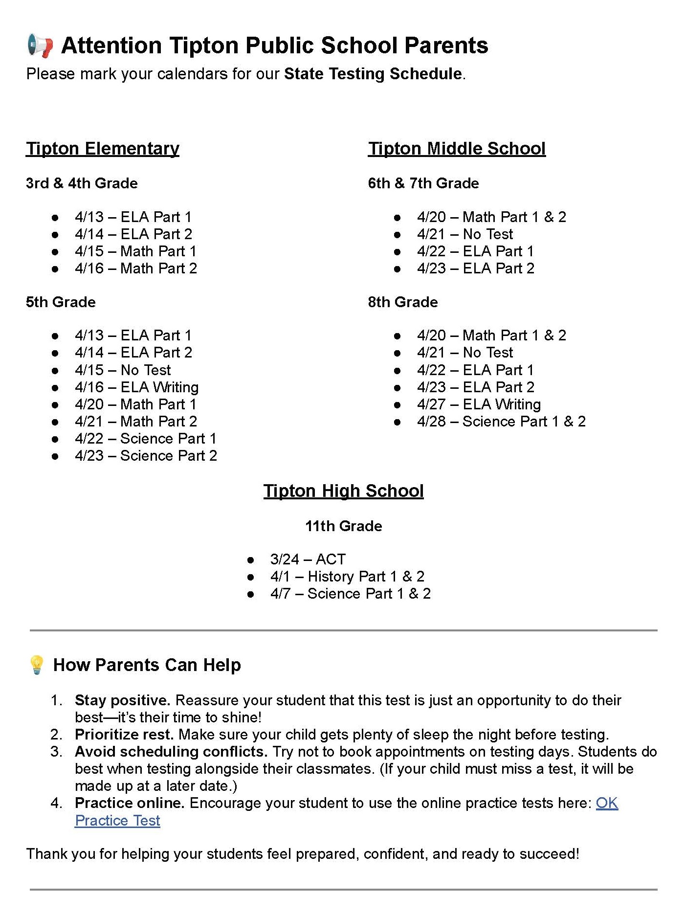 Tipton Public School State Testing Schedule - Starts March 13, 2026